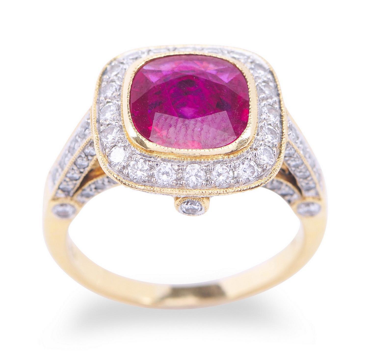 Featuring a cushion cut ruby weighing an estimated 1.84cts, within a diamond set border, shoulders and gallery totalling an estimated 1.06cts, in millegrain decoration, in two tone 18ct gold, ring size O.