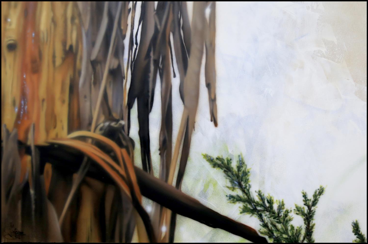 "This work epitomises my passion for local flora and fauna. The reference shot for this artwork was taken in Rochester at the property we stayed at during our solo project there. I was drawn to this tree by the amazing colours and the dynamic angles created from the falling bark."