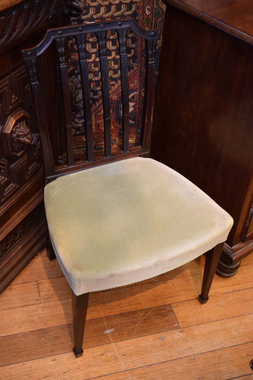 The back having carved vertical slats, above an upholstered seat, raised upon tapered legs with spade feet