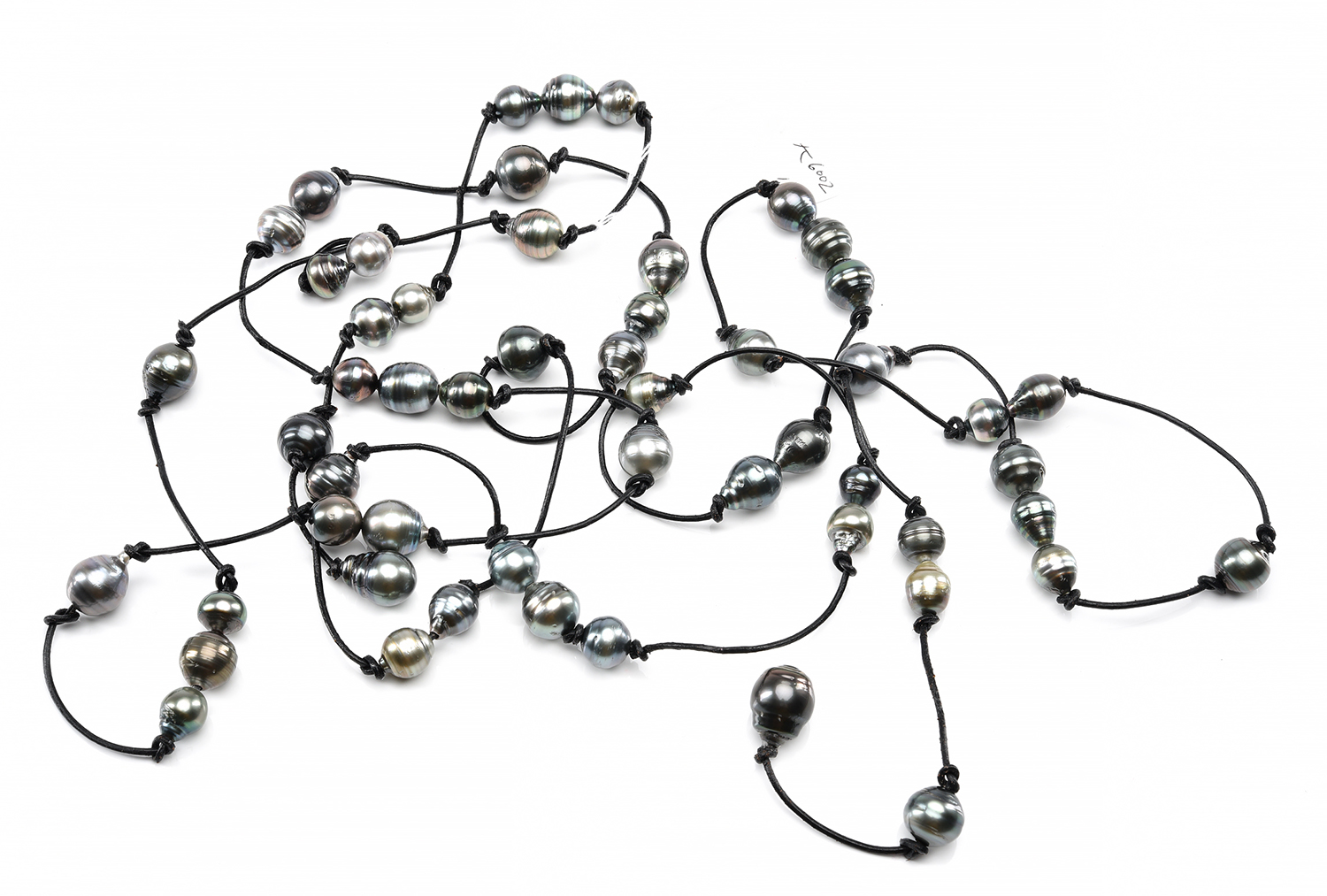 A LONG STRAND OF TAHITIAN PEARL ON LEATHER, TOTAL APPROXIMATE LENGTH 236CM