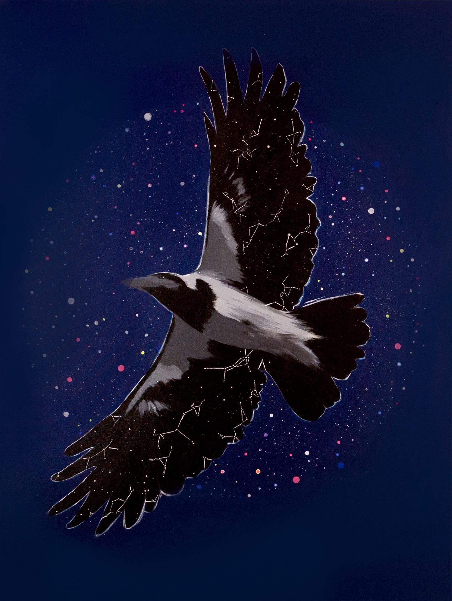 "This work shows a member of the crow family with imagined constellations on its wing traversing a darkened sky. It speaks of the power of animals to navigate the skies and our world. For many years scientists suspected that birds use the stars for navigation, but much is unknown. There are mysteries in their innate connection to the cosmos and this is a reminder of them." - The Artist -