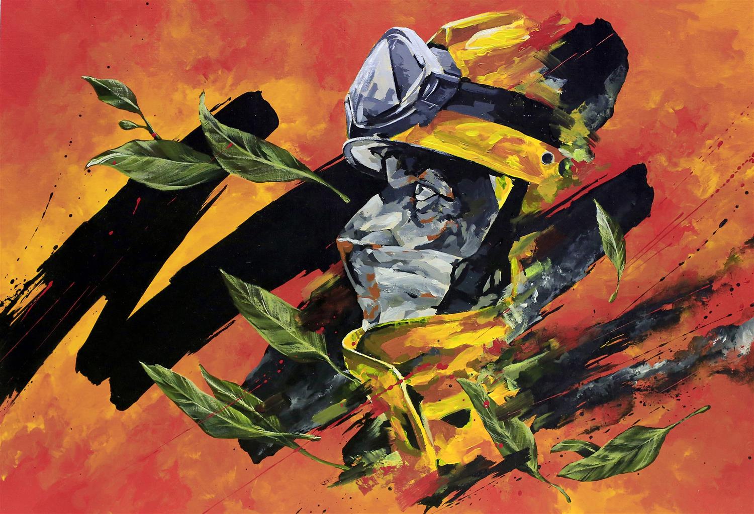 "This work on paper is representative of a collaborative mural, painted in South Melbourne, as our way of honouring those fighting the bushfire tragedy first-hand. It's a simple gesture intended as a sign of respect as well as a contribution to the collective consciousness that, regardless of our location, we are all connected."