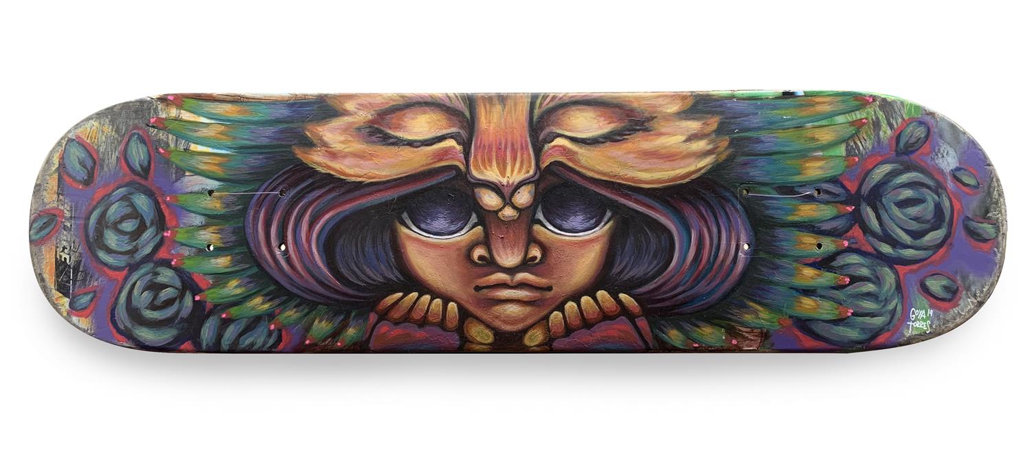 aerosol, acrylics, oils and posca pen on refurbished skateboard