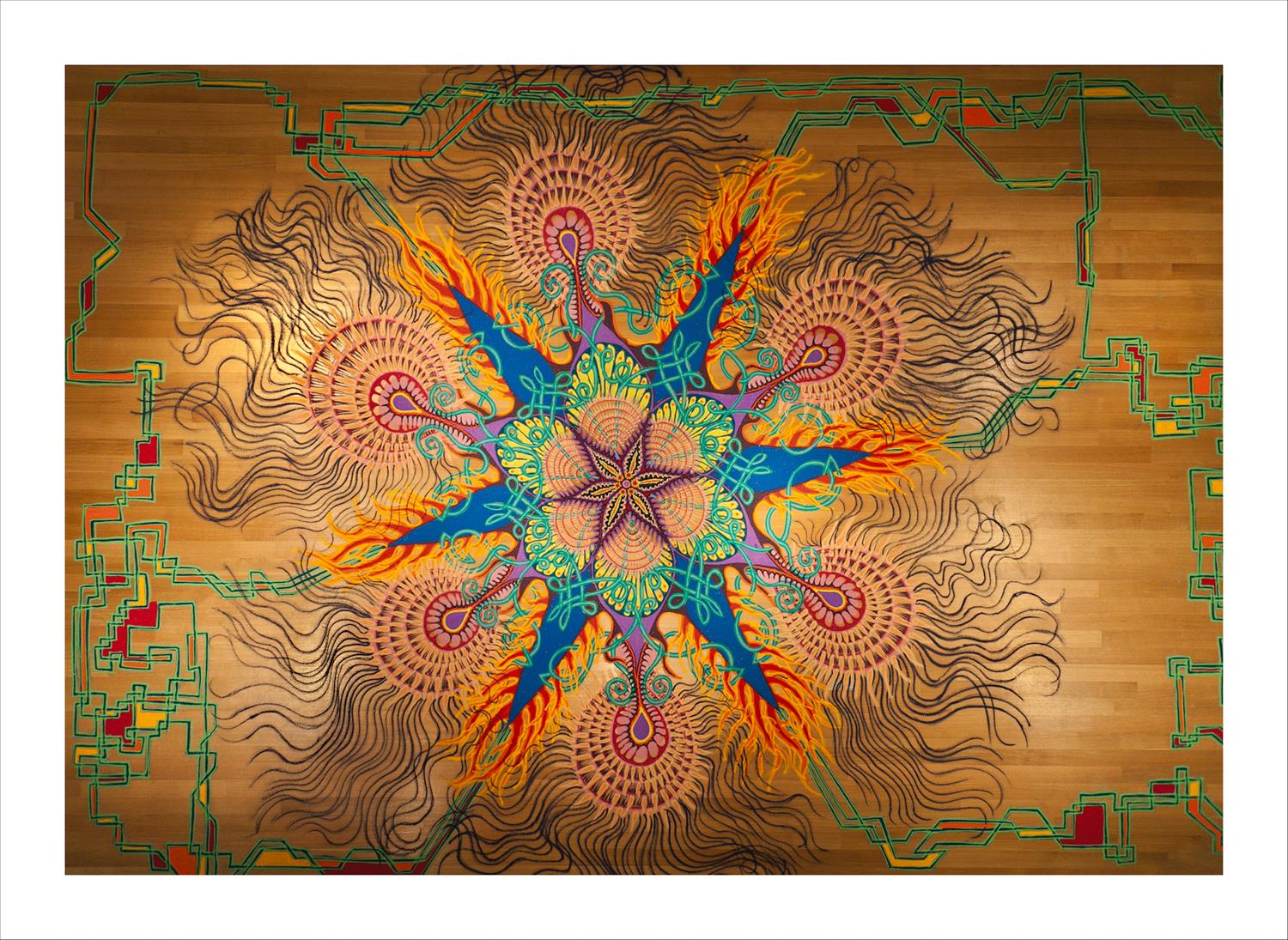 Asynchronus Syntropy is a coloured sand painting created at the Museum of ARt and Design in New York City as part of the 'Swept Away' exhibit in 2012 curated by David Revere McFadden.