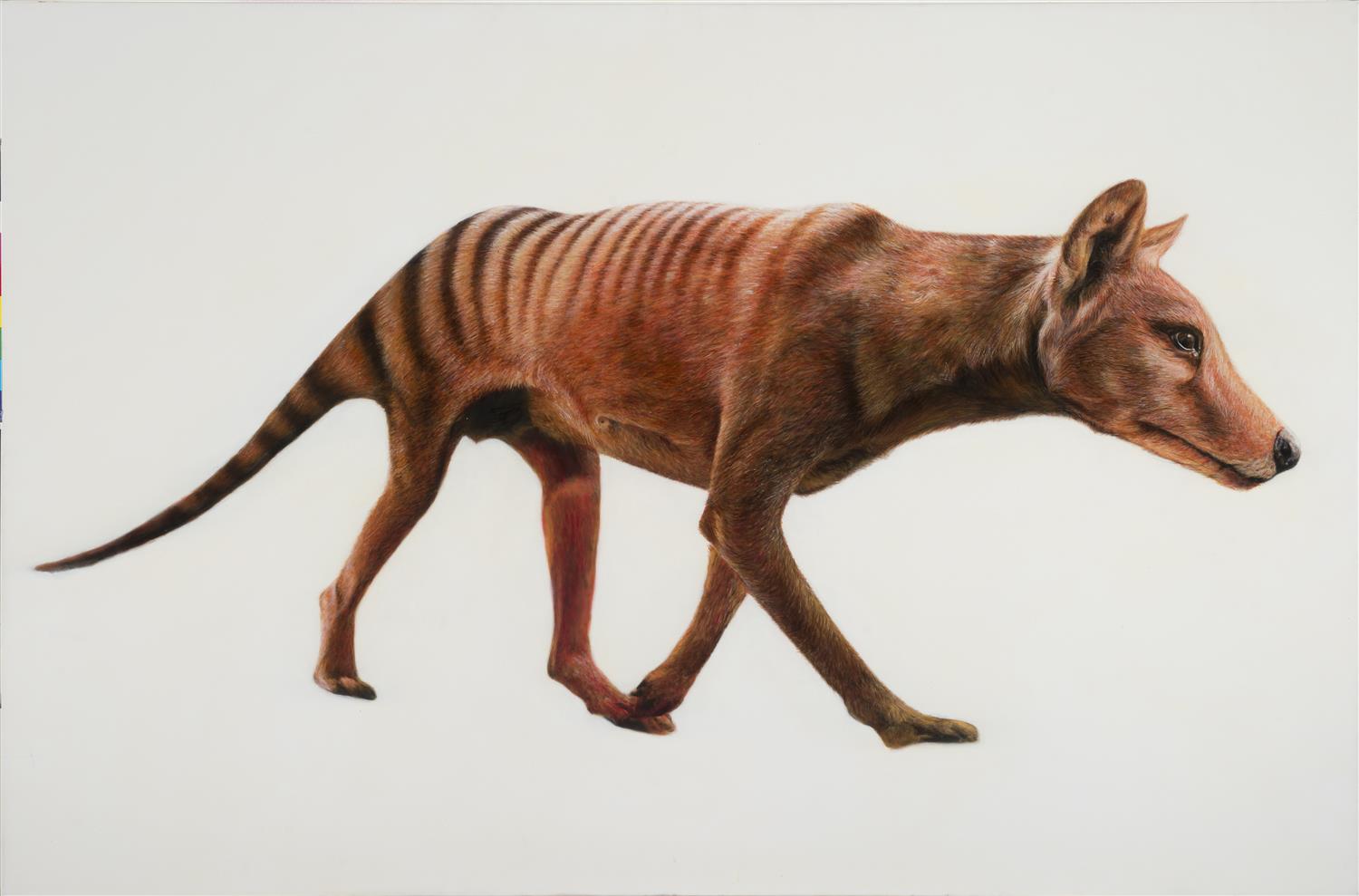 Once Upon A Time depicts the now extinct Tasmanian Tiger as an almost mythical creature, displaced, with its natural environment painted over in white; a poignant reminder that we often do not appreciate beauty until it's gone forever.