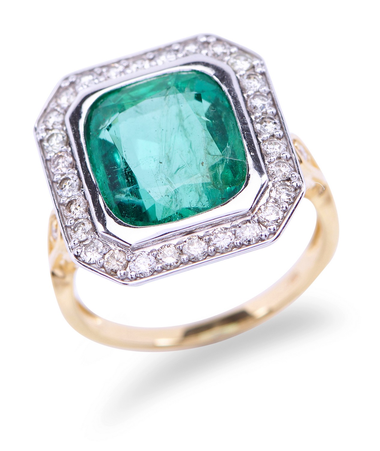 A CUSHION CUT EMERALD OF 5.20CTS AND DIAMOND RING IN PLATINUM, SIZE J, 6.5GMS