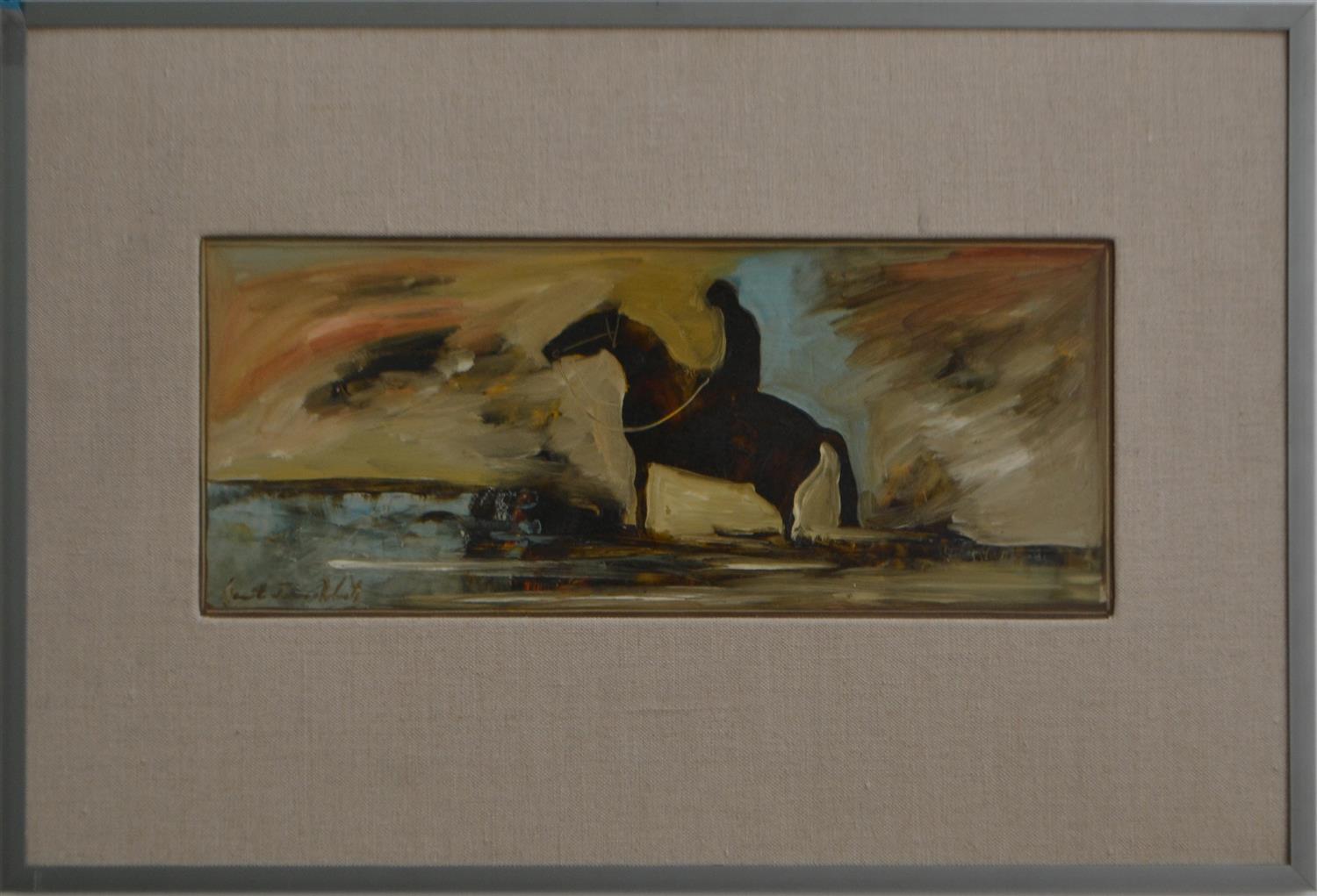 GARETH JONES-ROBERTS, HORSE AND RIDER, OIL ON BOARD, 17.5 X 42.5CM FRAME SIZE: 42 X 62CM, CONDITION: VERY GOOD