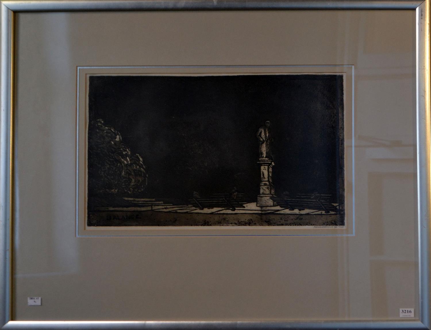 JUDITH ALEXANDROVICS, LAW AND ORDER: BALANCE 1990, ETCHING UNIQUE, 31.5 X 46CM, FRAME SIZE: 69 X 78CM, CONDITION: COCKLING AND DISCOLOURATION
