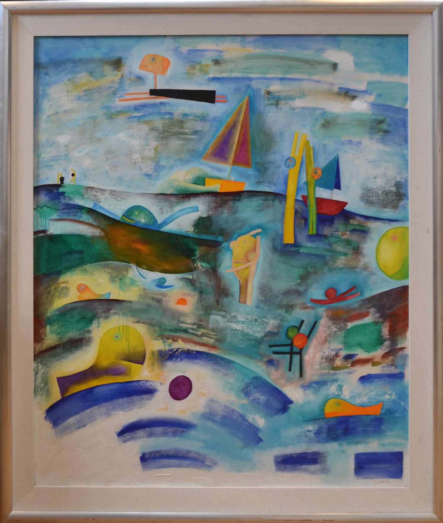RAFAEL GURVICH, AT THE BEACH, OIL ON CANVAS, 120 X 100CM FRAME SIZE: 140 X 120CM, CONDITION: GOOD