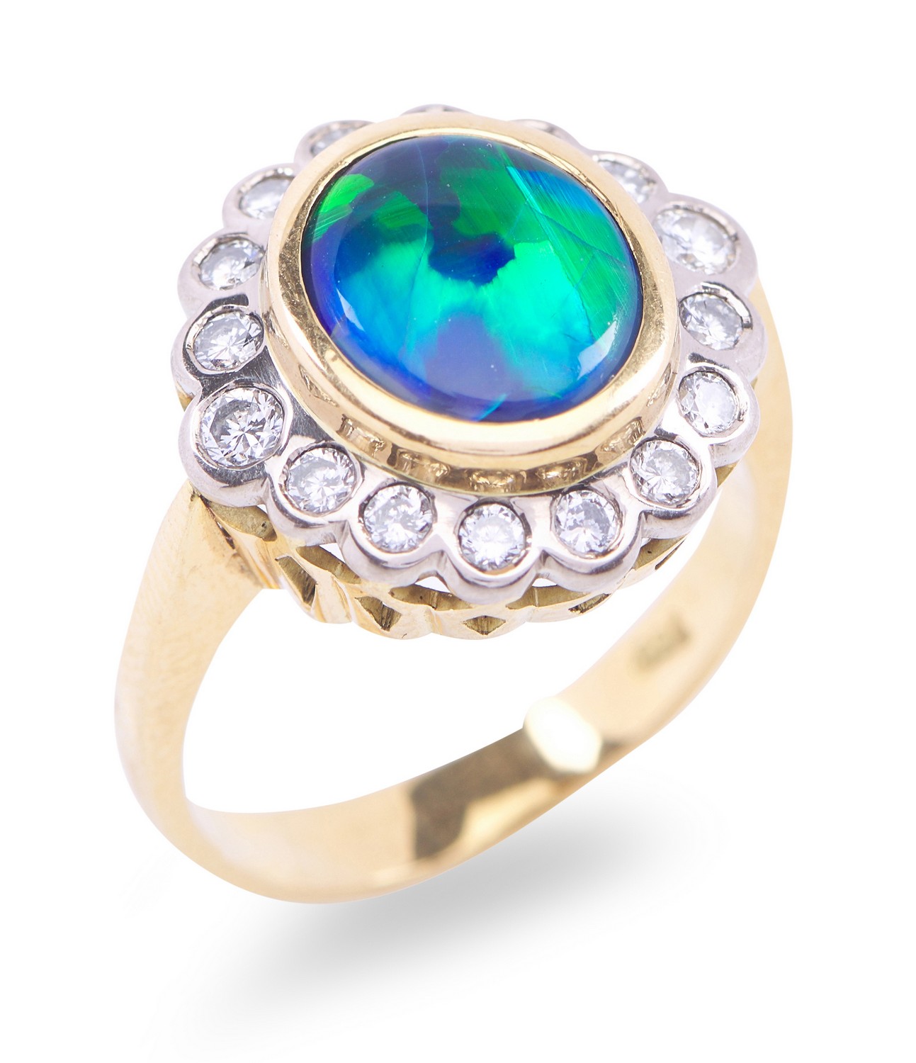 The ring presents in good condition overall with only minor evidence of wear. Some internal crazing to opal. Opal dimensions 9.53mm x 8.36 mm x 4.66mm (estimated weight 2.10cts). Diamonds total an estimated 0.43cts.