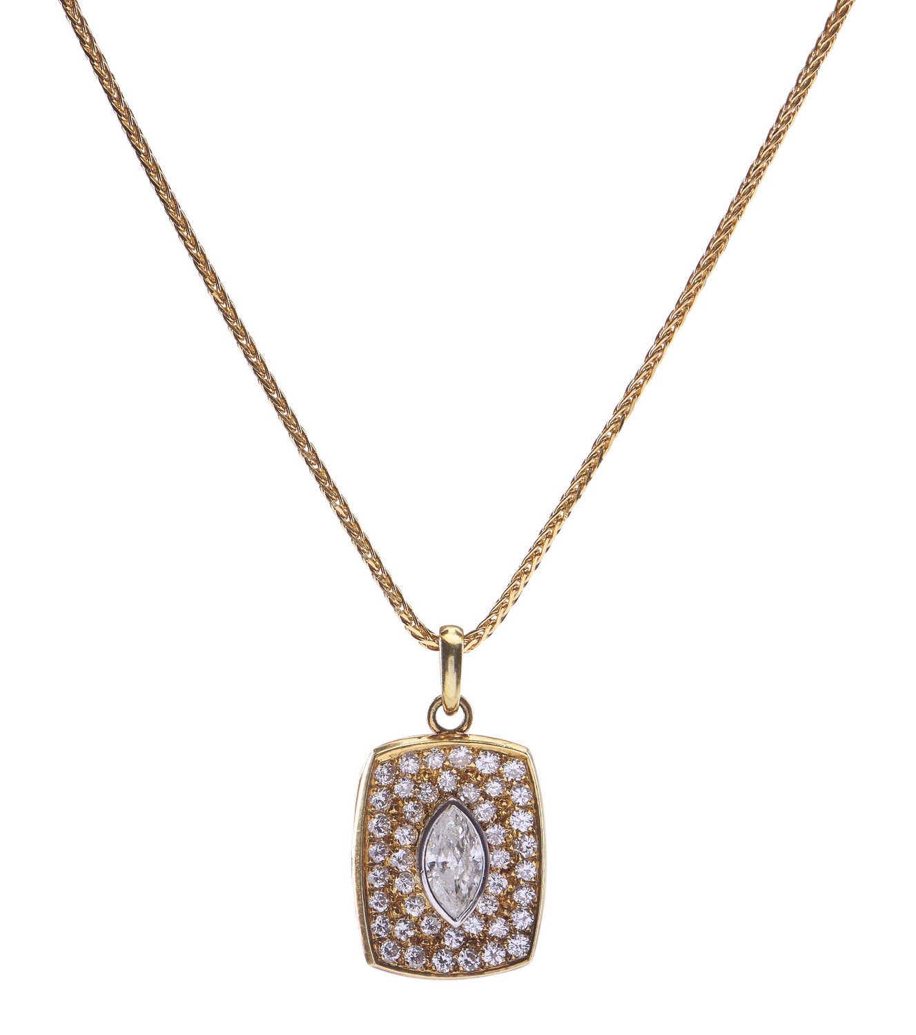 The pendant presents in good condition overall. Diamonds are all secure. The marquise diamond is estimated I-J/P1