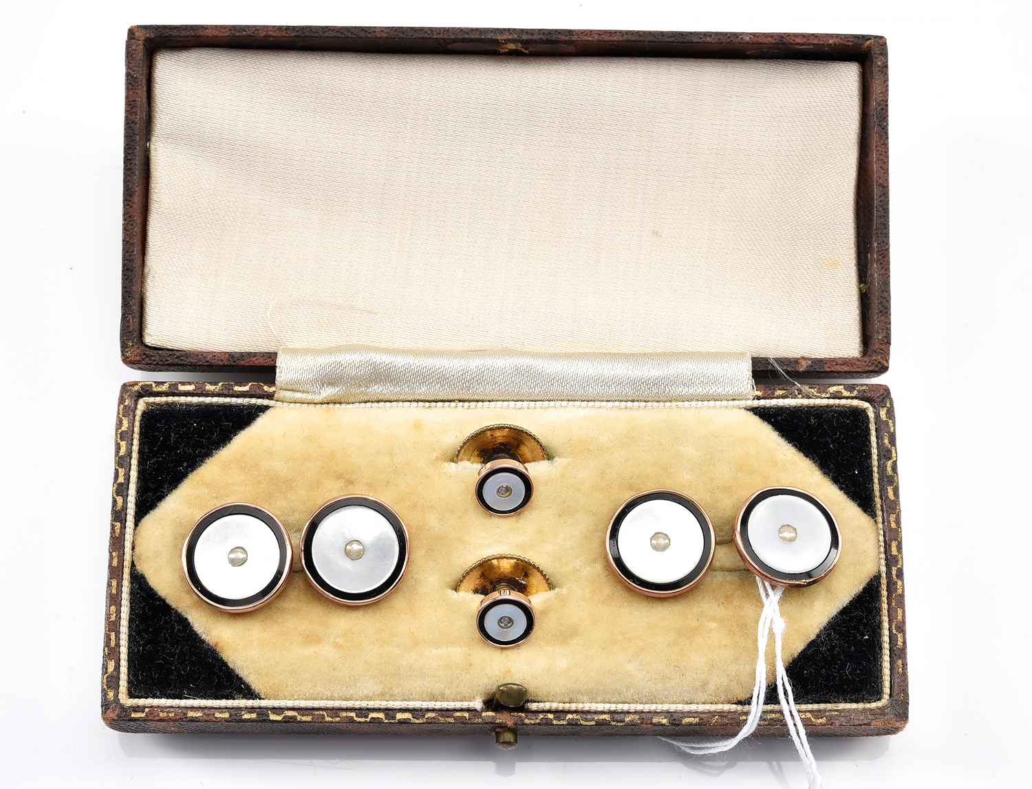 A PAIR OF MOTHER OF PEARL CUFFLINKS AND SET OF SHIRT STUDS IN 9CT GOLD, BOXED
