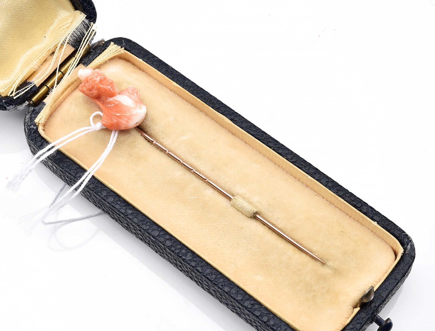 A CARVED CORAL STICK PIN IN GOLD, BOXED