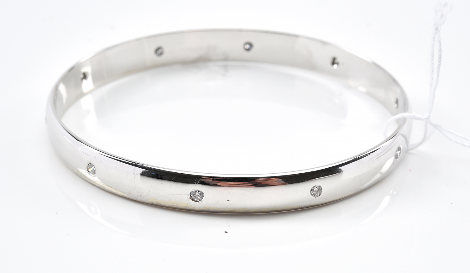 A BANGLE WITH TEN HAMMER SET DIAMONDS IN 9CT WHITE GOLD