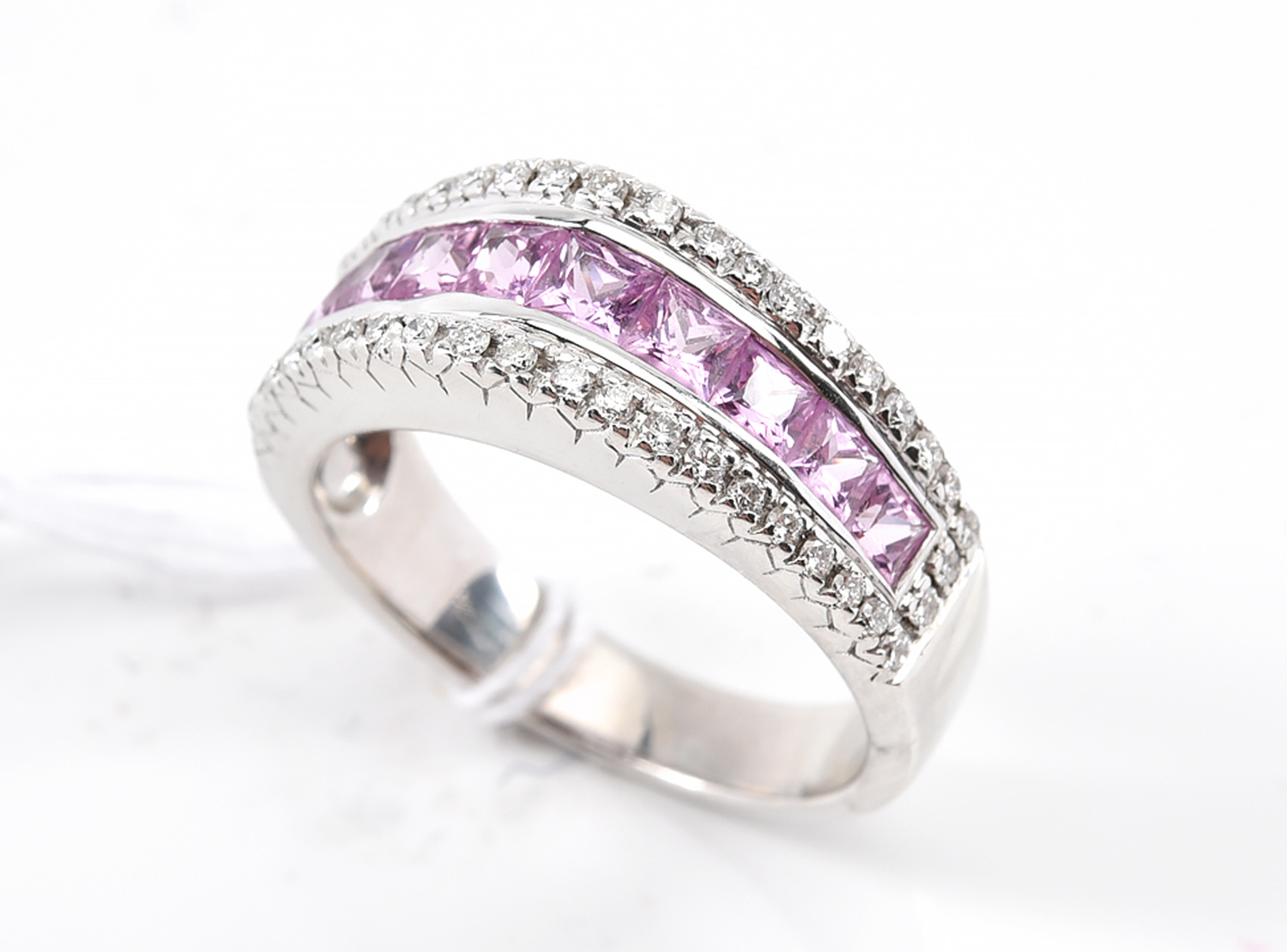 A PINK SAPPHIRE AND DIAMOND DRESS RING IN 18CT WHITE GOLD, RING SIZE M