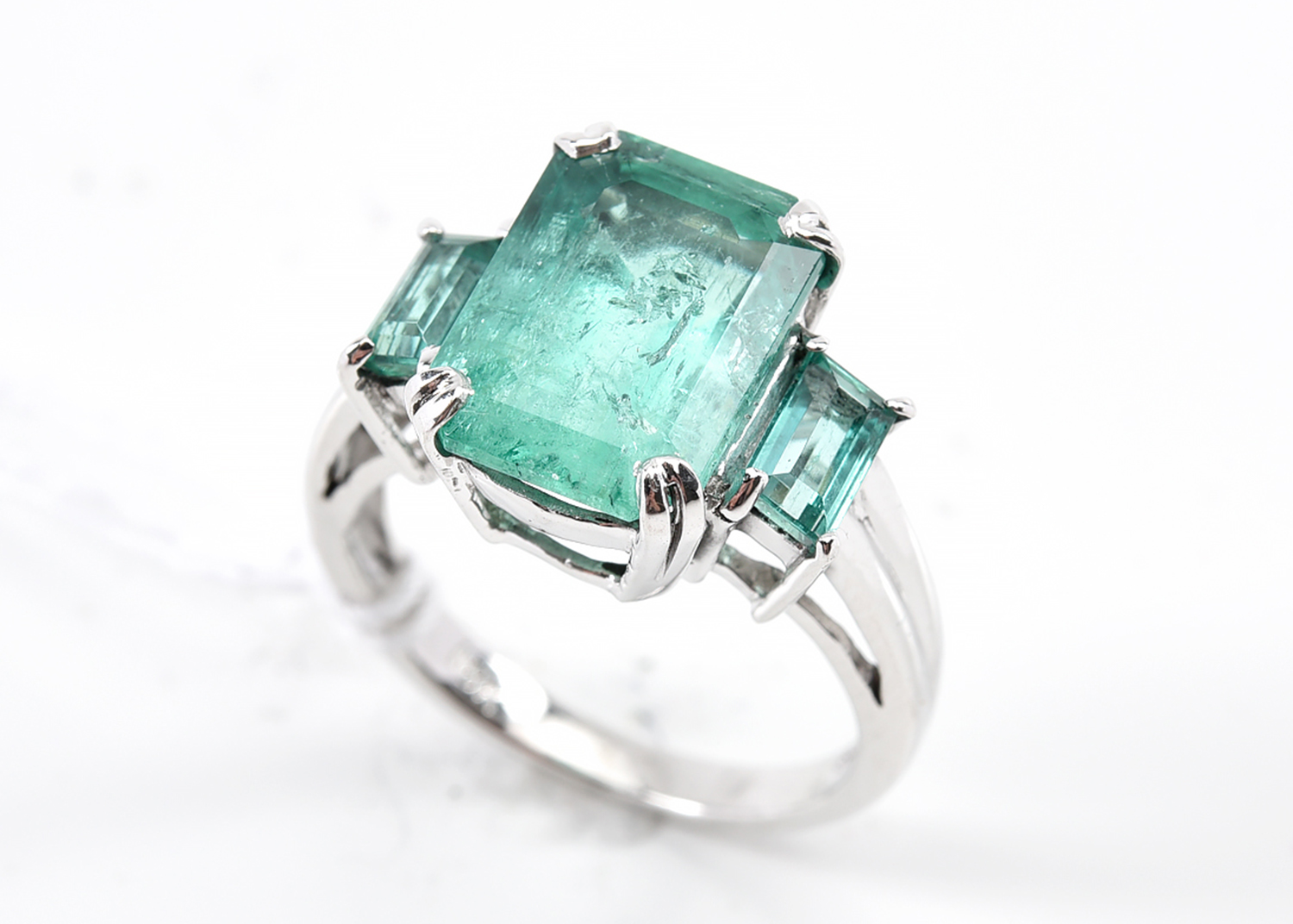 A THREE STONE COLOMBIAN EMERALD RING IN 18CT WHITE GOLD, SIZE L, 5GMS