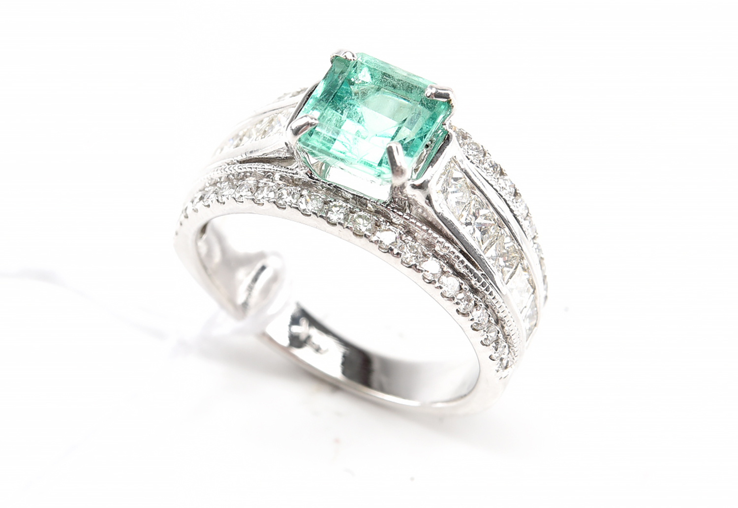 A COLOMBIAN EMERALD AND DIAMOND RING IN 18CT WHITE GOLD, RING SIZE J-K, 5GMS