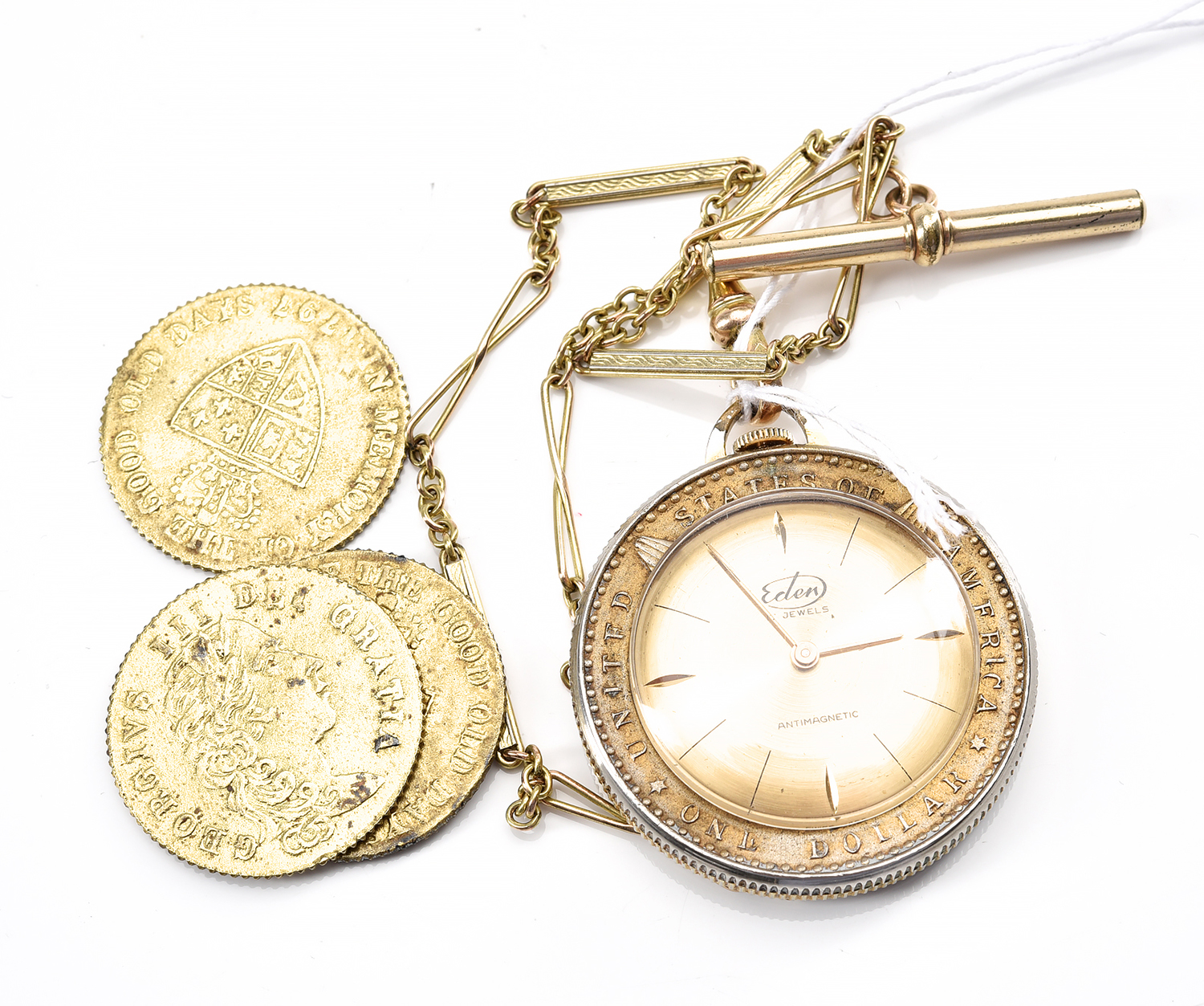 A POCKET WATCH SET TO AN AMERICAN ONE DOLLAR 'E PLURIBUS UNUM' COIN WITH A FANCY LINK FOB CHAIN, GOLD LINED, TOGETHER WITH THREE GEORGE III 'IN MEMORY OF THE GOOD OLD DAYS' REPRODUCTION GAMING TOKENS DATED 1797