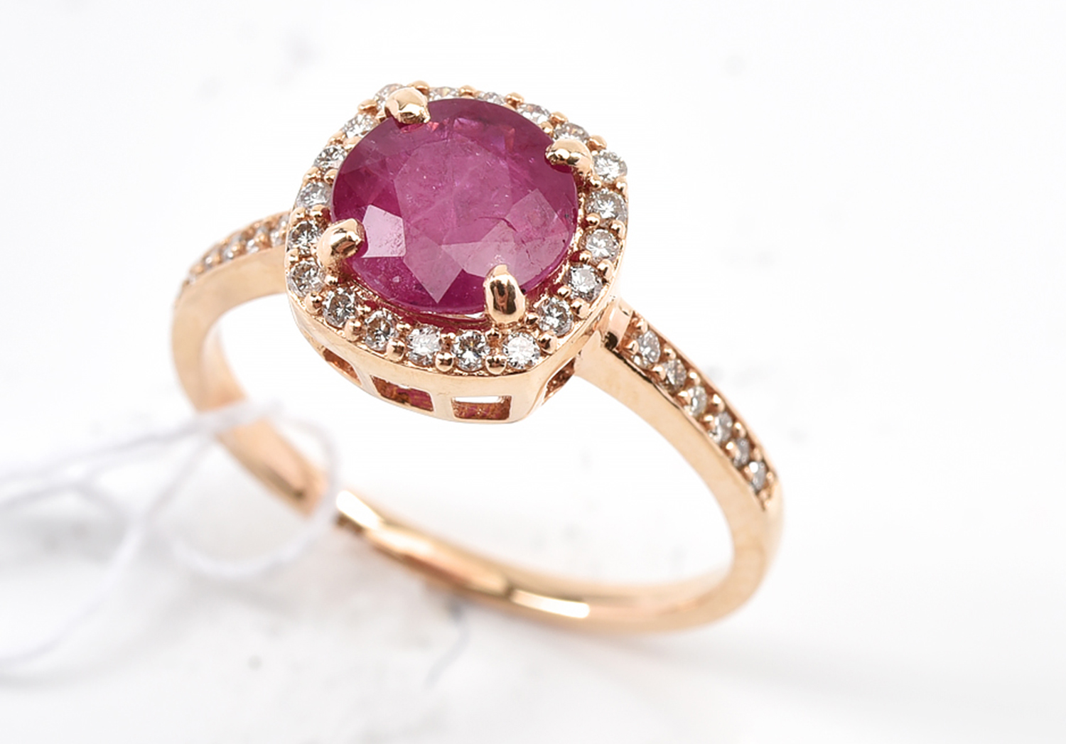 A RUBY AND DIAMOND CLUSTER RING IN 18CT PINK GOLD, RING SIZE N, 3.3GMS