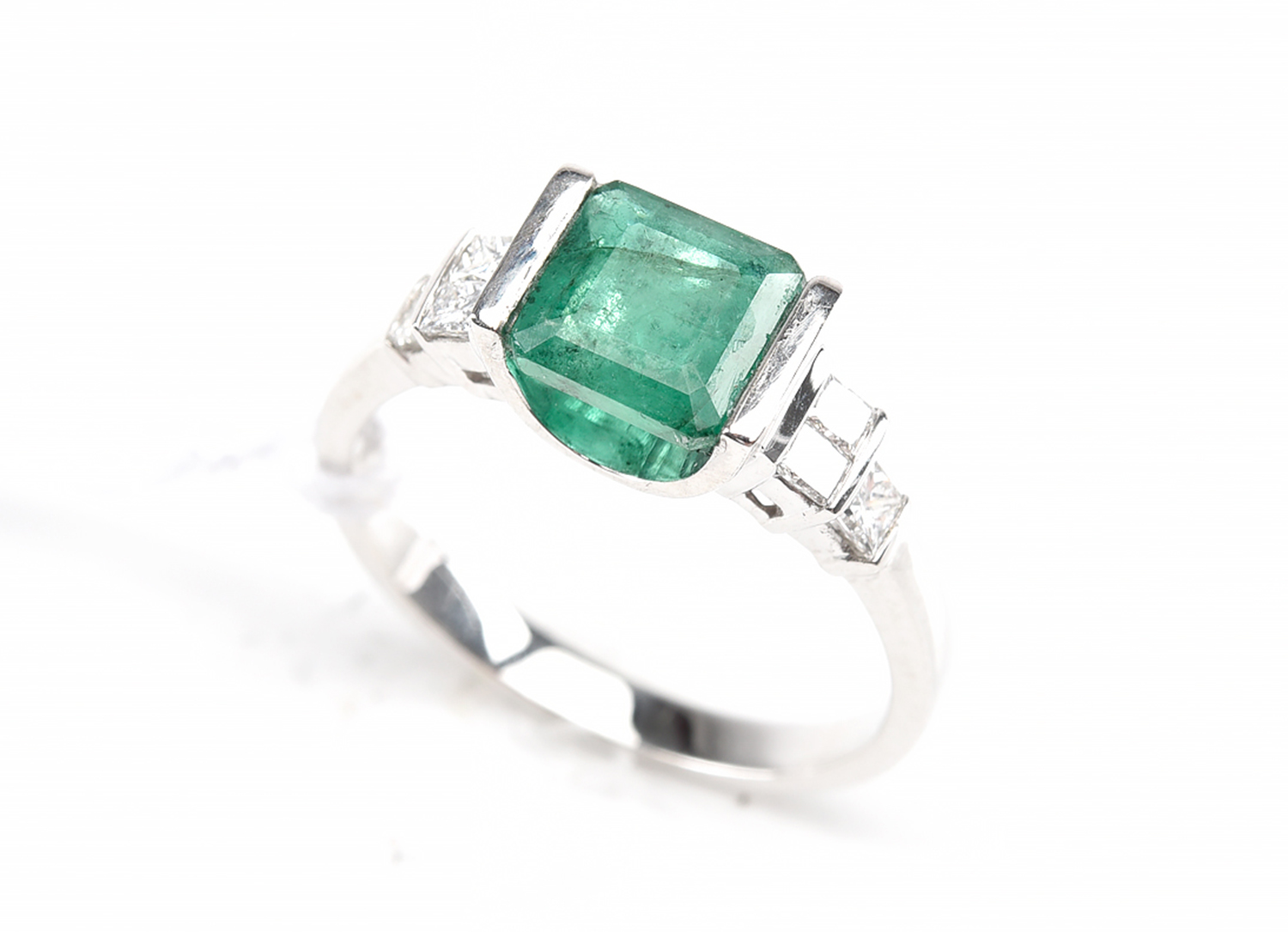AN EMERALD OF 1.24CTS AND DIAMOND RING IN 18CT WHITE GOLD, RING SIZE N