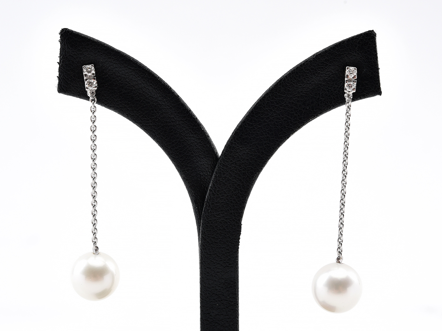 A PAIR OF PEARL AND DIAMOND DROP EARRINGS IN 18CT WHITE GOLD, TO POST AND BUTTERFLY FITTINGS, TOTAL LENGTH 35MM