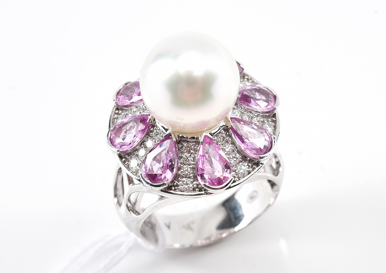 A SOUTH SEA PEARL, PINK SAPPHIRE AND DIAMOND RING IN 18CT WHITE GOLD, SIZE M