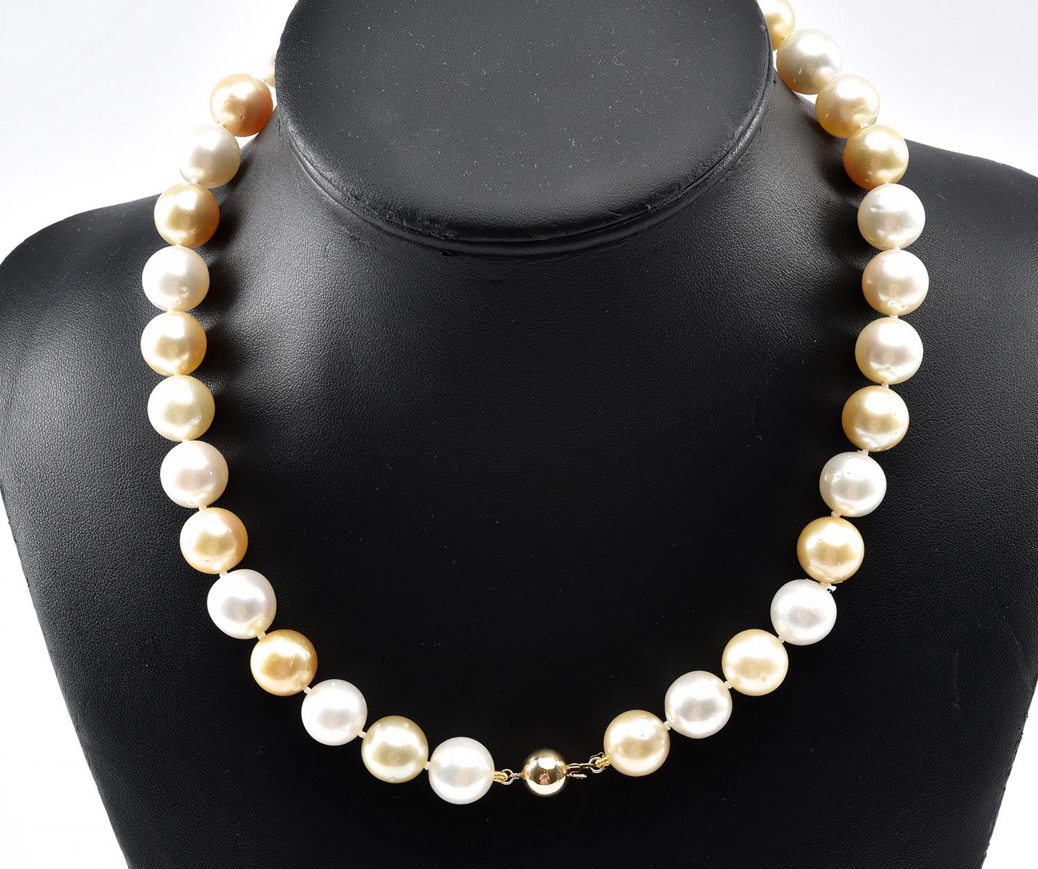 A SOUTH SEA PEARL NECKLACE OF CREAM AND GOLDEN HUES TO 9CT GOLD BALL CLASP, LENGTH 48CMS