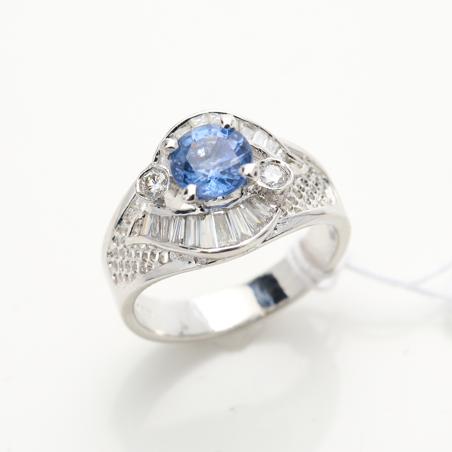A BLUE SAPPHIRE AND DIAMOND DRESS RING IN 18CT WHITE GOLD, SIZE L