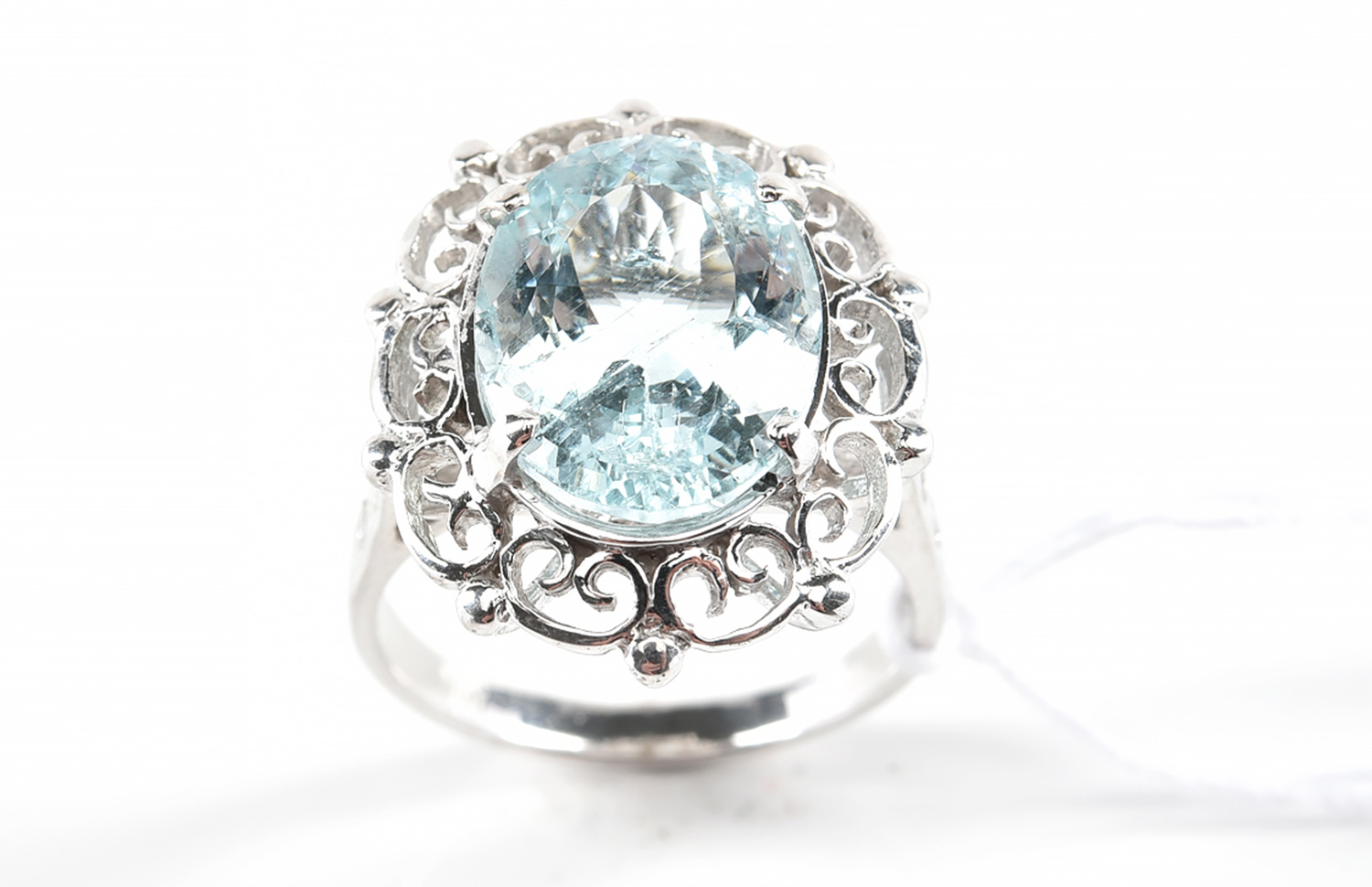AN AQUAMARINE AND DIAMOND SET RING, THE OVAL AQUAMARINE WEIGHING APPROXIMATELY 5.58CTS, SIZE M