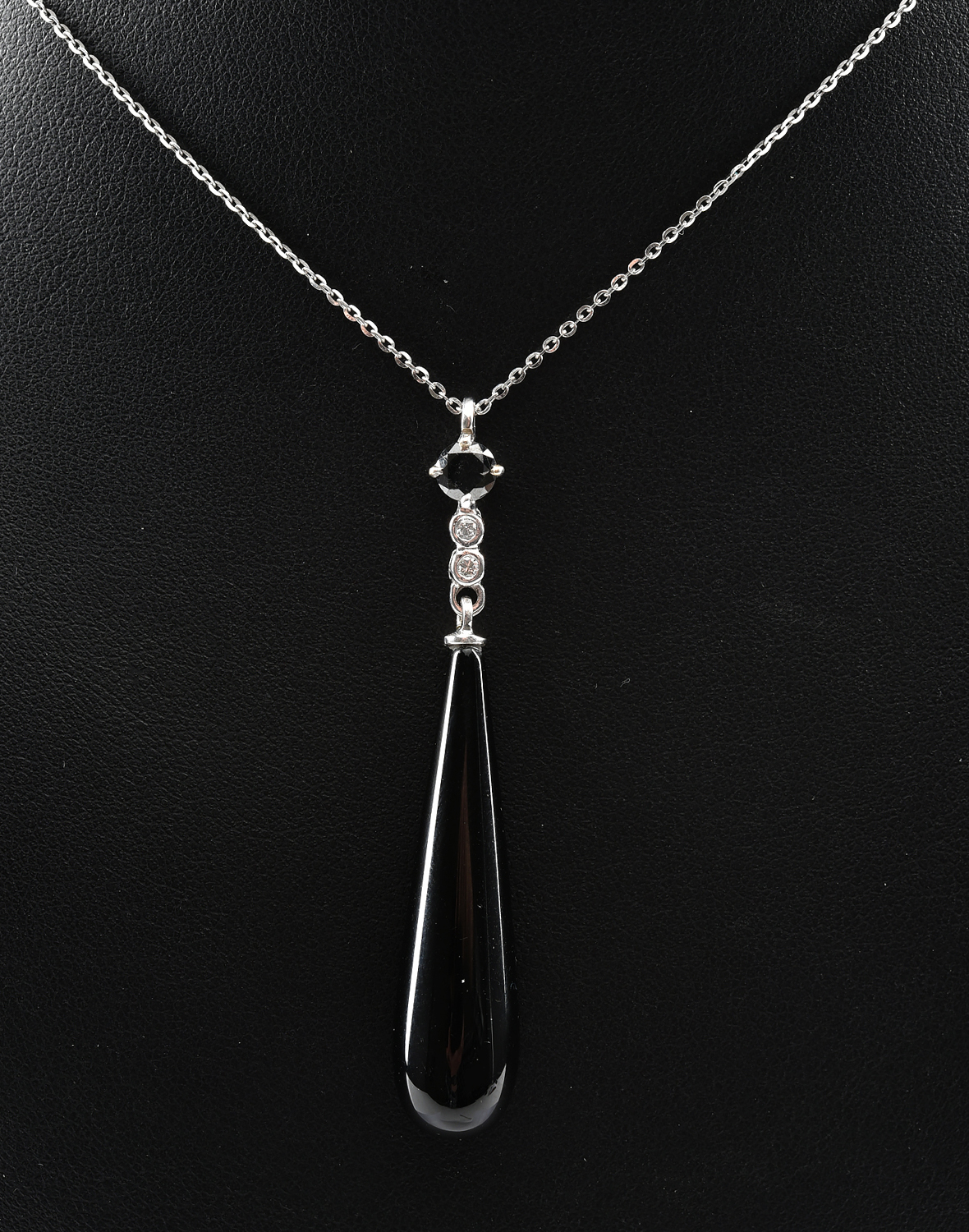 AN ART DECO STYLE DROP PENDANT IN 18CT WHITE GOLD, COMPRISING AN ONYX DROP SUSPENDED FROM A BLACK DIAMOND AND DIAMOND SET MOUNT, TO A FINE TRACE CHAIN IN 18CT WHITE GOLD