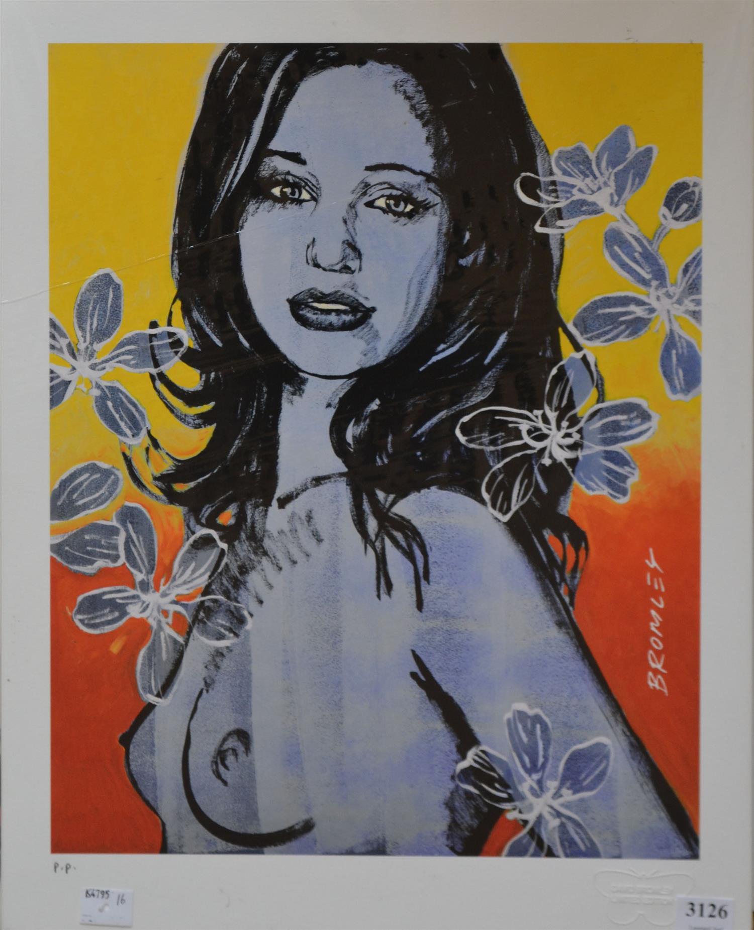 A DAVID BROMLEY PRINT, GILLIAN WITH FLOWERS, DIGITAL PRINT P/P, UNSIGNED, 36 X 28.5 CM, IMAGE SIZE: 36 X 28.5 CM, UNFRAMED, GOOD CONDITION WITH NO FAULTS, PAPER SIZE: 43 X 33CM