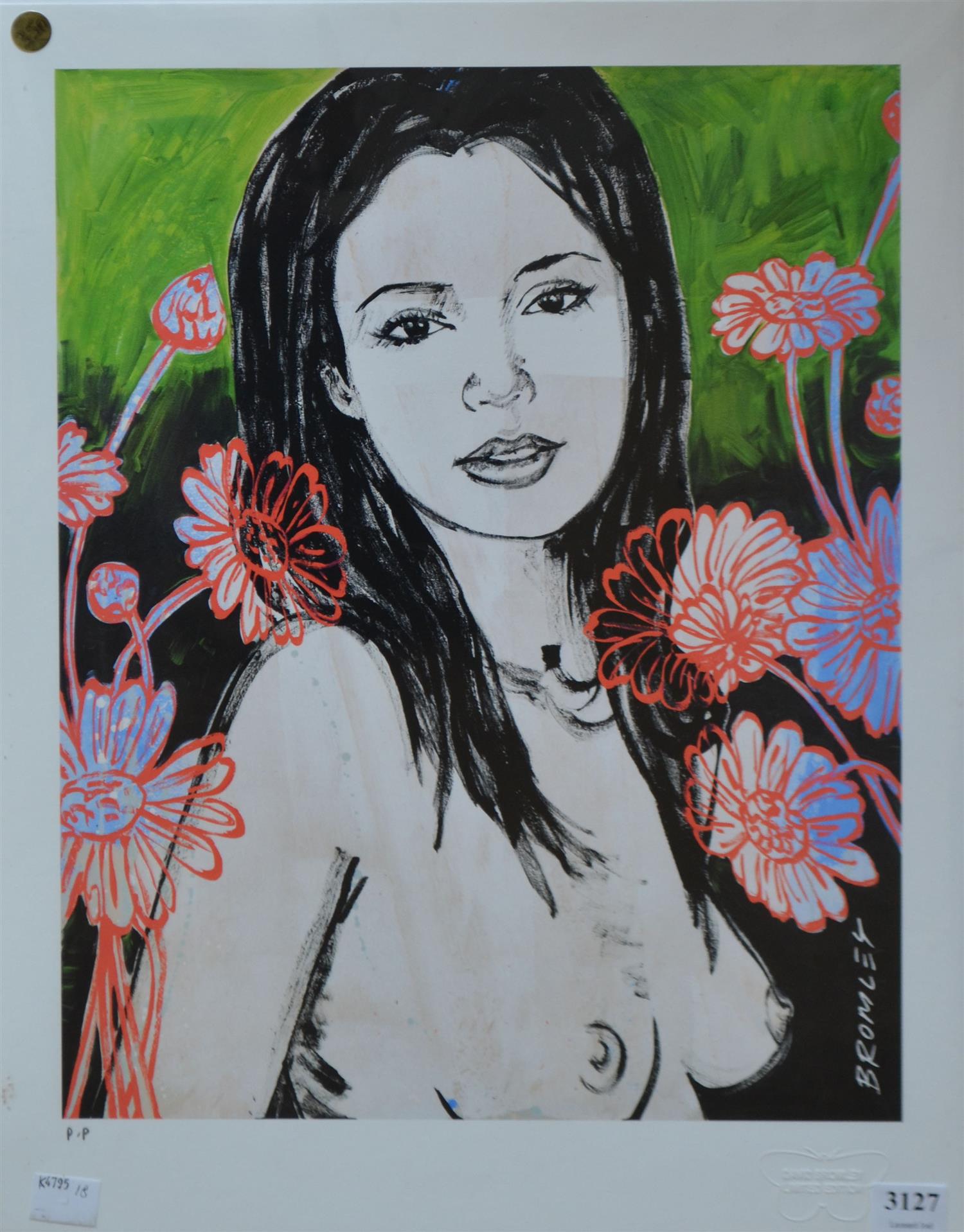 A DAVID BROMLEY PRINT, MALLORY WITH FLOWERS, DIGITAL PRINT P/P, UNSIGNED, 36 X 28.5 CM, UNFRAMED, GOOD CONDITION WITH NO FAULTS