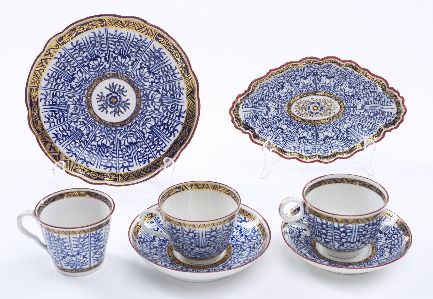 Comprising an oval dish, marked Flight with a crescent to base, a cake plate, three tea cups and two saucers.