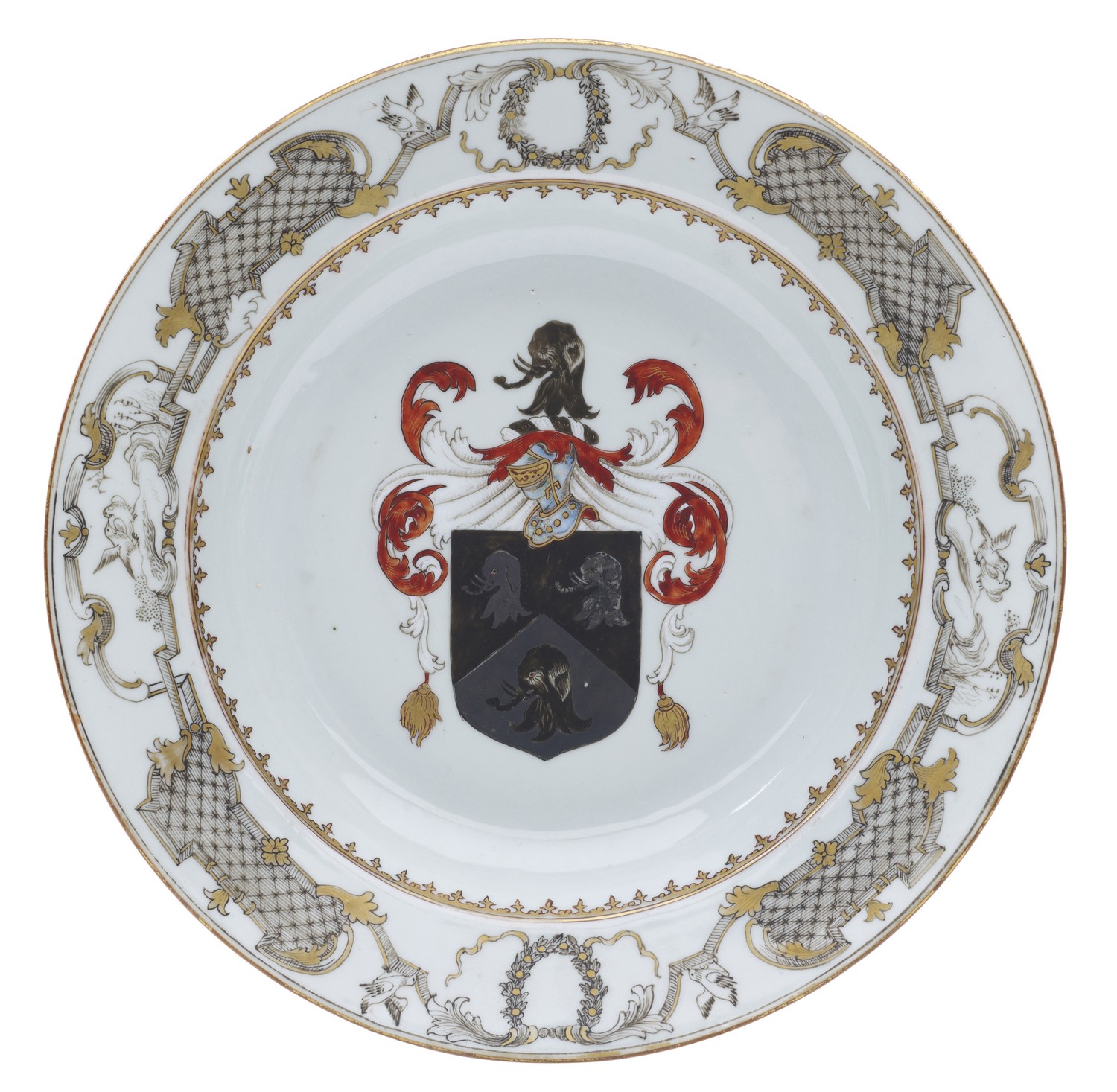 Decorated to the rim with rococo scrolls and panel en grisaille and to the centre with a large armorial crest. The border of this plate is painted en grisaille with a European strapwork design reminiscent of the style introduced by Cornelis Pronk and there is a gilt rim and an inner line of spearheads. Within the border there are laurel wreathes and pairs of billing doves symbolising matrimony and love. The central arms with the elaborate mantling typical of the 1740s might appear to be rather dull, with its colours of iron-red, gilt and black, but the base of the shield and the two upper elephant heads were originally enamelled in silver which has tarnished over time. The plate is from a service made for Thomas Saunders and it takes us to India and the East India Company headquarters at Fort St George, Madras. Thomas Saunders was appointed Governor of Madras on 19th September 1750; he remained as Governor of Madras until 14th January 1755 when he returned to England.