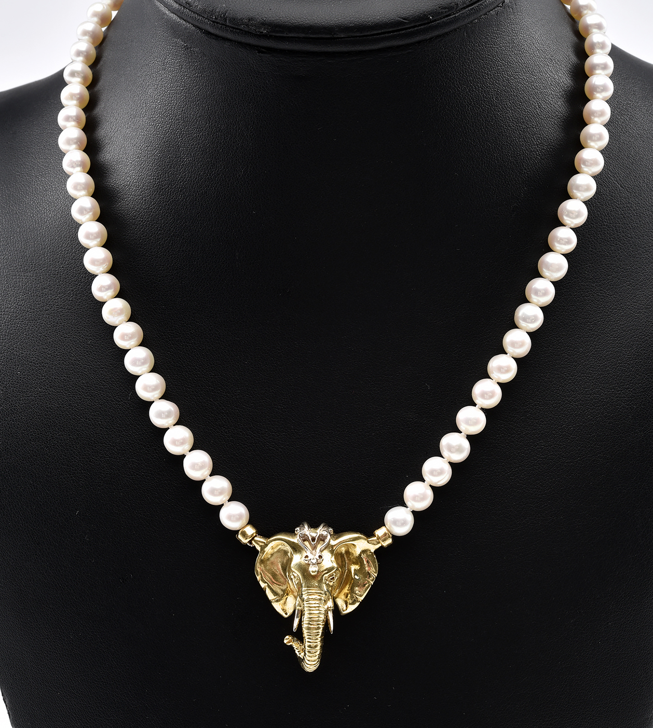 A PEARL NECKLACE WITH ELEPHANT PENDANT IN 18CT GOLD, TOTAL LENGTH 440MM