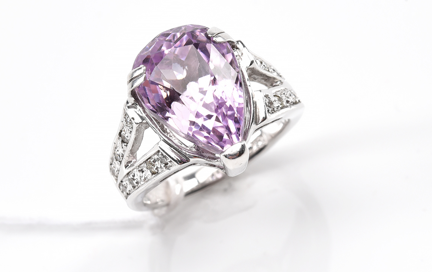 A KUNZITE AND DIAMOND PENDANT NECKLACE - The large oval kunzite weighing 91.38cts, in a double claw setting with diamond set bale, t...