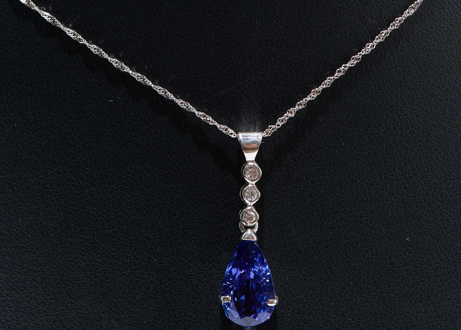 A TANZANITE AND DIAMOND PENDANT, TO A FINE TRACE CHAIN, ALL IN 18CT WHITE GOLD, TOTAL LENGTH 44CMS, 3.1GMS
