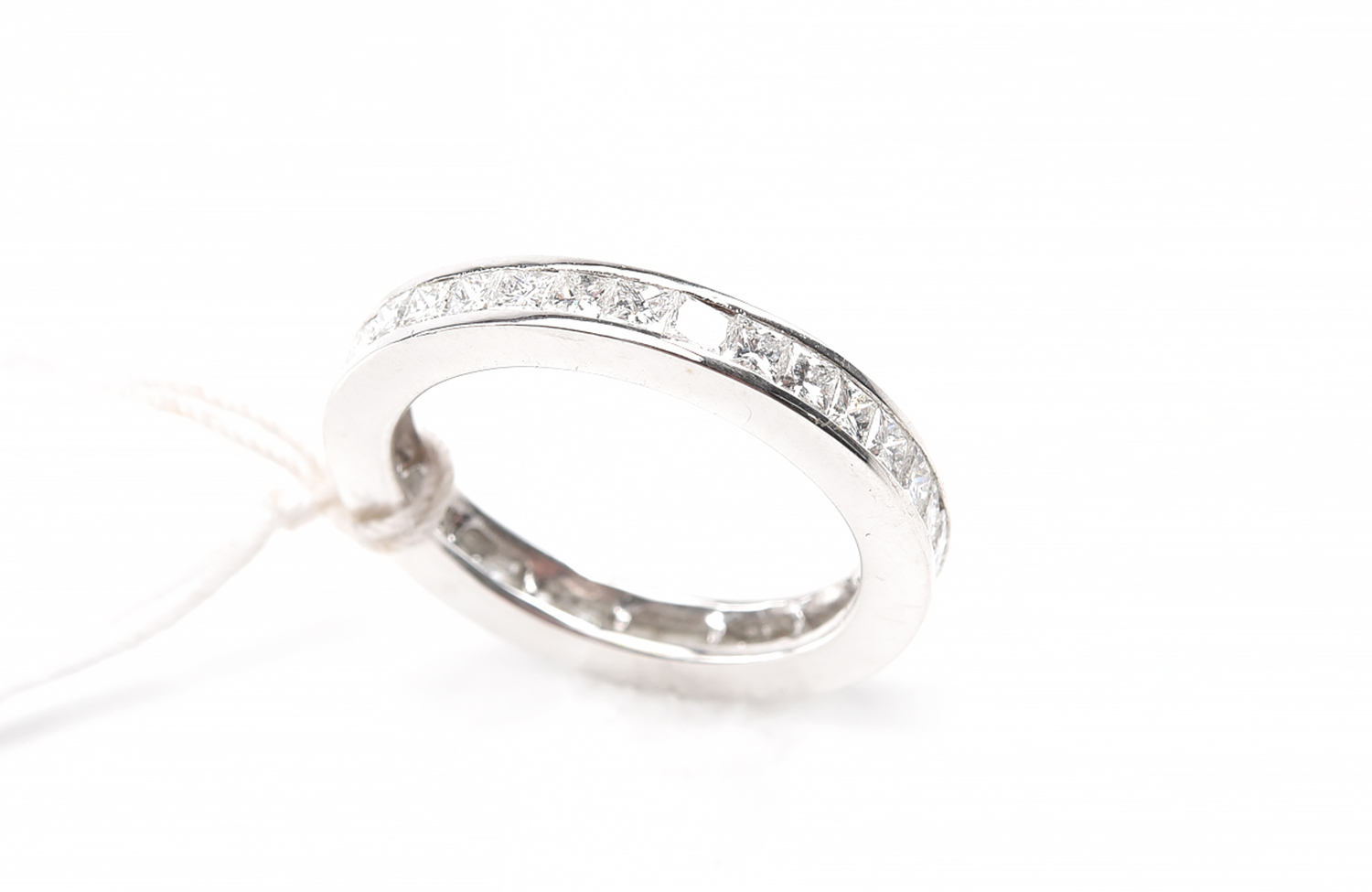A PRINCESS CUT DIAMOND ETERNITY RING IN 18CT WHITE GOLD, DIAMONDS TOTALLING 2.24CTS, SIZE J, 2.8GMS