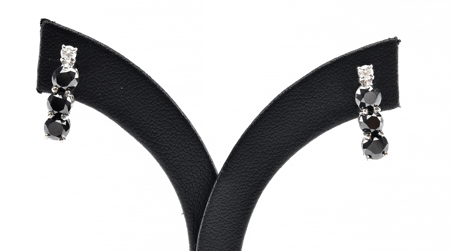 A PAIR OF BLACK AND WHITE DIAMOND EARRINGS IN 18CT GOLD, BLACK DIAMONDS TOTALLING 2.80CTS, TOTAL LENGTH 15MM