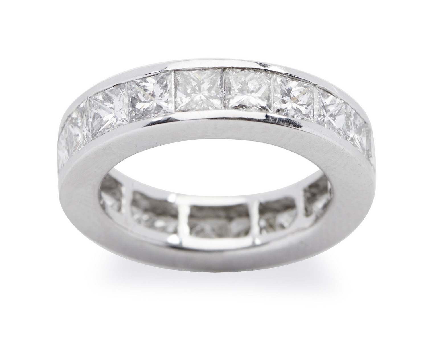 A DIAMOND ETERNITY RING SET WITH TWENTY ONE PRINCESS CUT DIAMOND TOTALLING 6.50CTS, IN 18CT WHTE GOLD, SIZE L, 7GMS