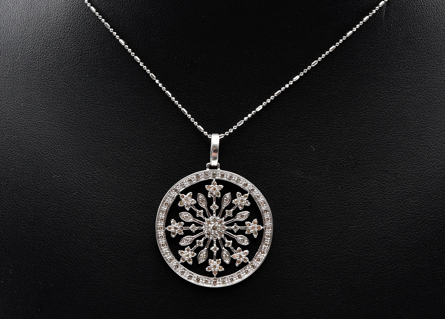 A DIAMOND SNOWFLAKE PENDANT TO FINE LINK CHAIN IN 9CT WHITE GOLD, DIAMETER OF THE PENDANT 30MM, 6.4GMS