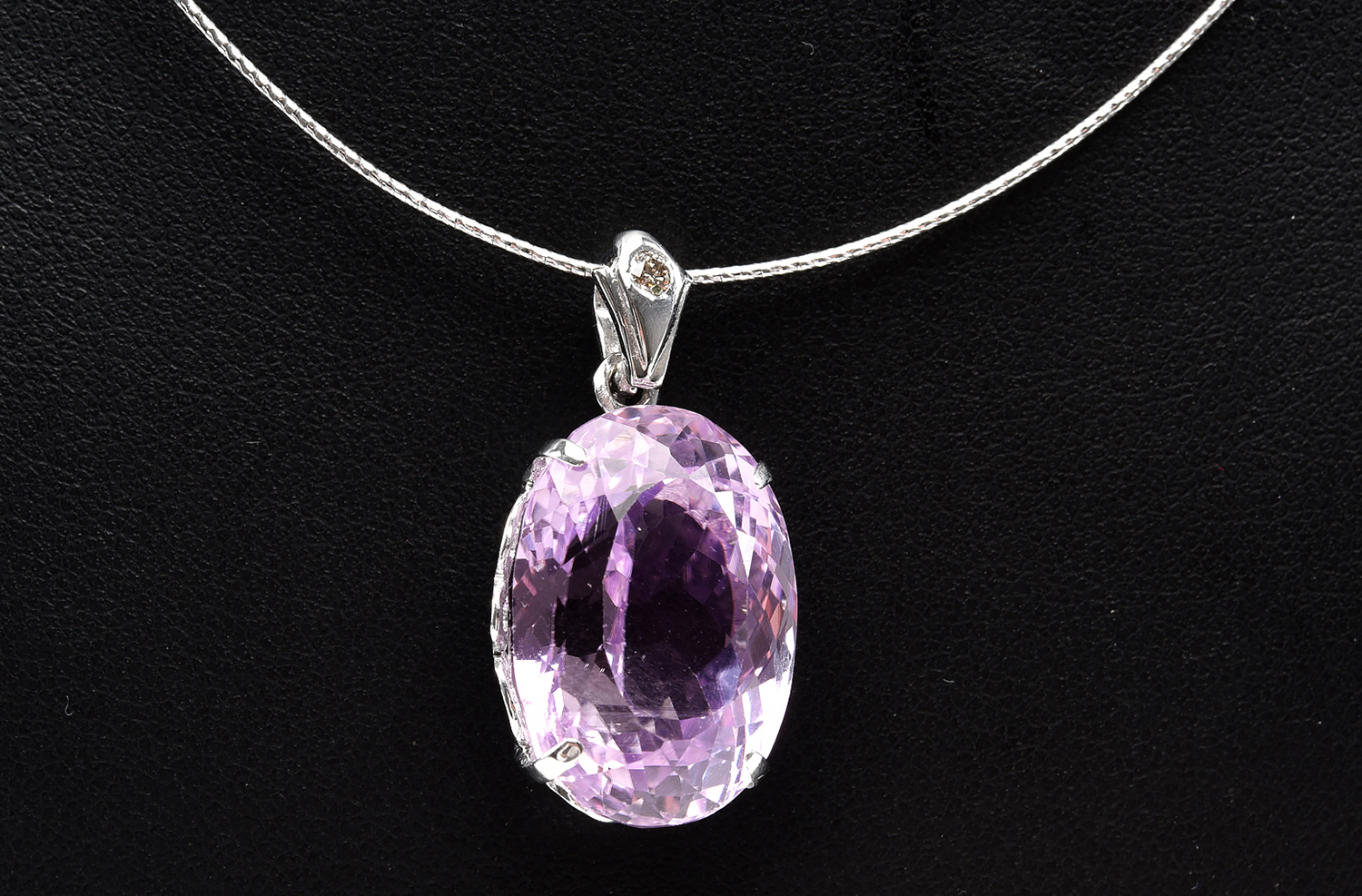 A KUNZITE PENDANT OF 26.70CTS, TO AN OMEGA CHAIN IN 18CT WHITE GOLD, 12.23GMS
