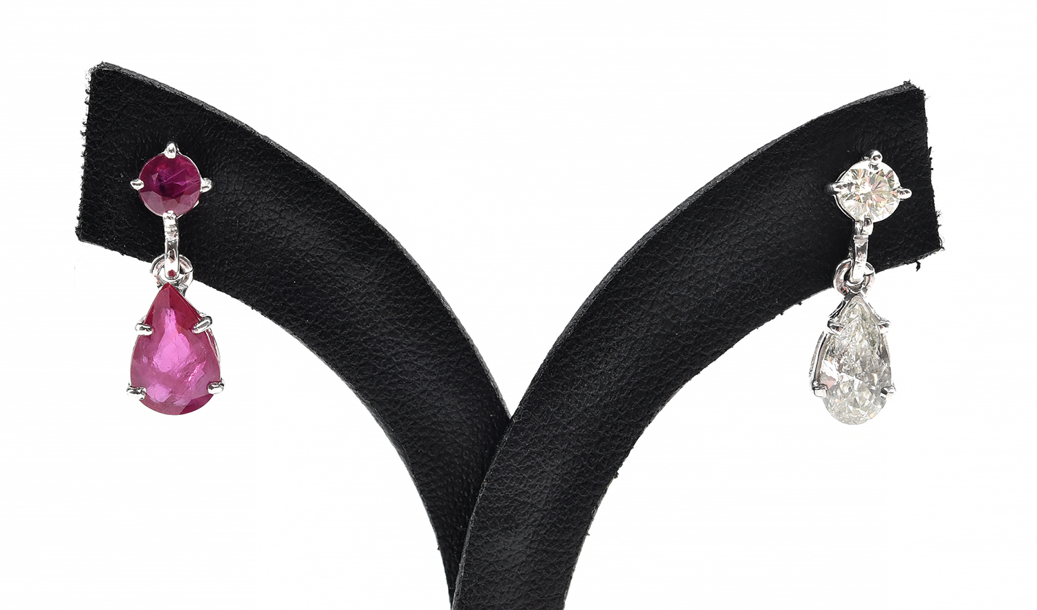 A PAIR OF RUBY AND DIAMOND EARRING-Comprising a pear cut diamond suspended from a round brilliant cut diamond all totalling 0.65cts, the other earring comprising a pear cut ruby suspended from a round cut ruby totalling 1.82cts, to post and butterfly fittings in 18ct white gold.
