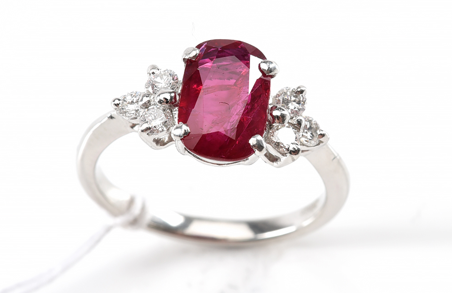 In as new condition. ruby measures approximately 9.32 x 6.17 x 2.58mm. Diamonds are approximately VS in clarity and G in colour. Total weight 4.45grams.