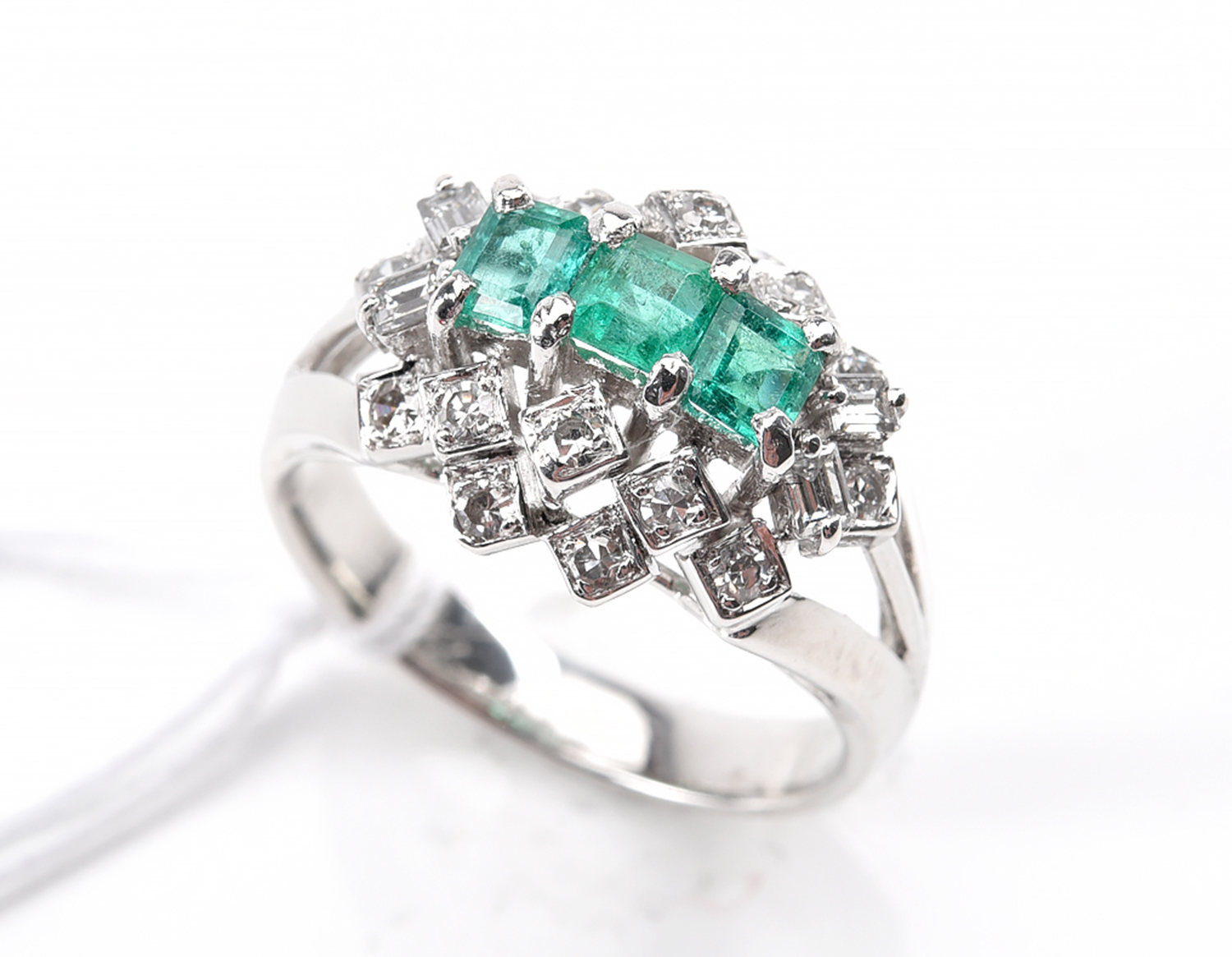 AN EMERALD AND DIAMOND DRESS RING IN 18CT WHITE GOLD, SIZE O, 5.9GMS