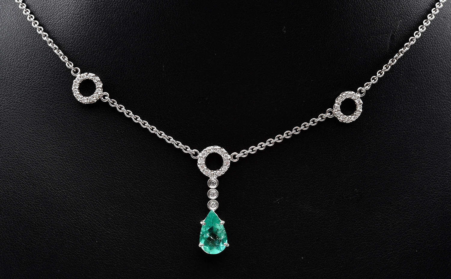 In as new condition. The pear cut emerald measures 11.1 x 6.9 x 3.9mm. The diamonds are approximately G to H in colour and SI in clarity. The necklace weighs 8.63grams.