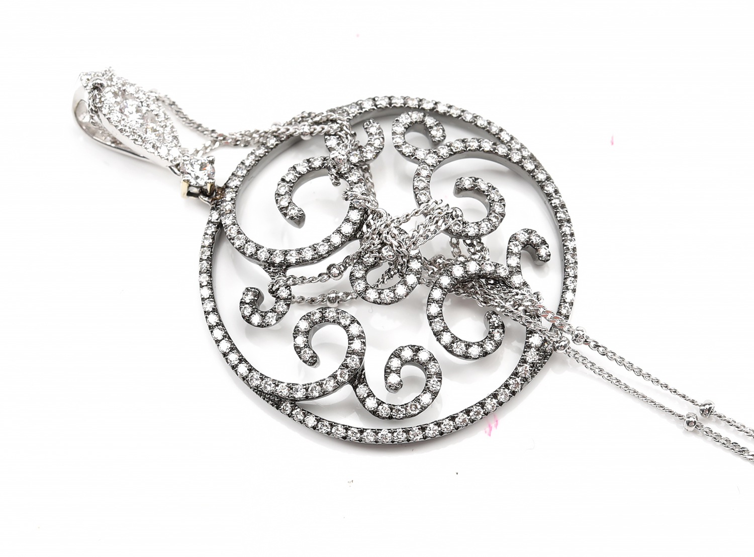 A KUNZITE AND DIAMOND PENDANT NECKLACE - The large oval kunzite weighing 91.38cts, in a double claw setting with diamond set bale, t...