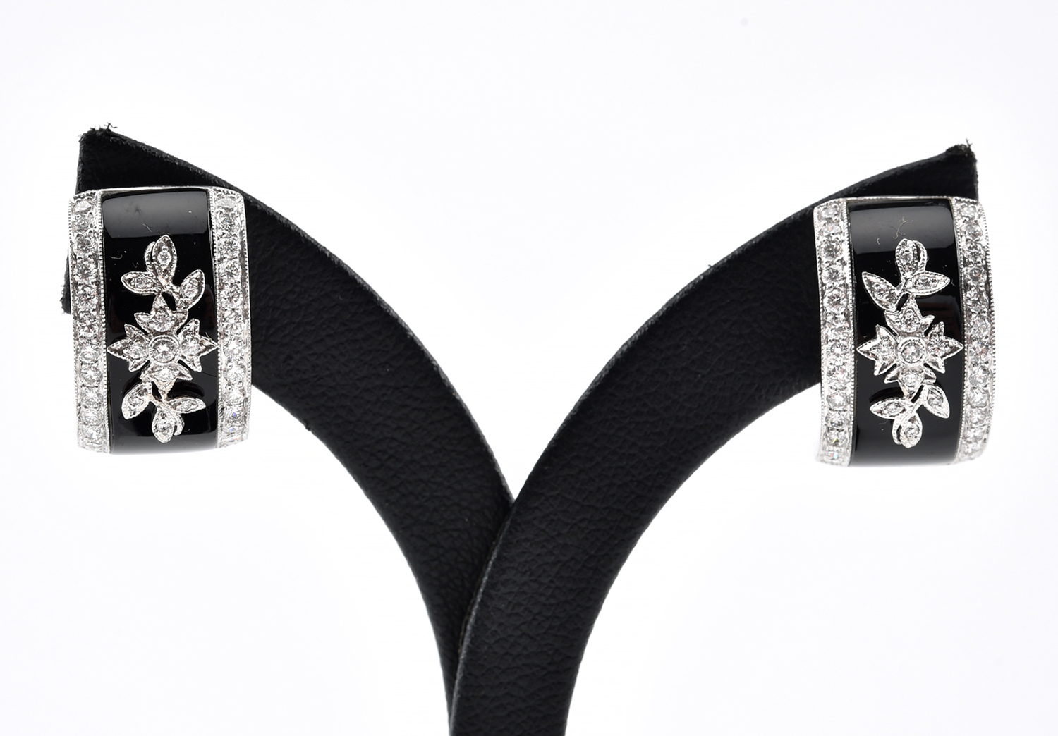 A PAIR OF ONYX AND DIAMOND EARRINGS-Each hinged hoop, set with an onyx panel with central floral diamond motif and diamond set border, to hinged post fittings, in 18ct white gold.