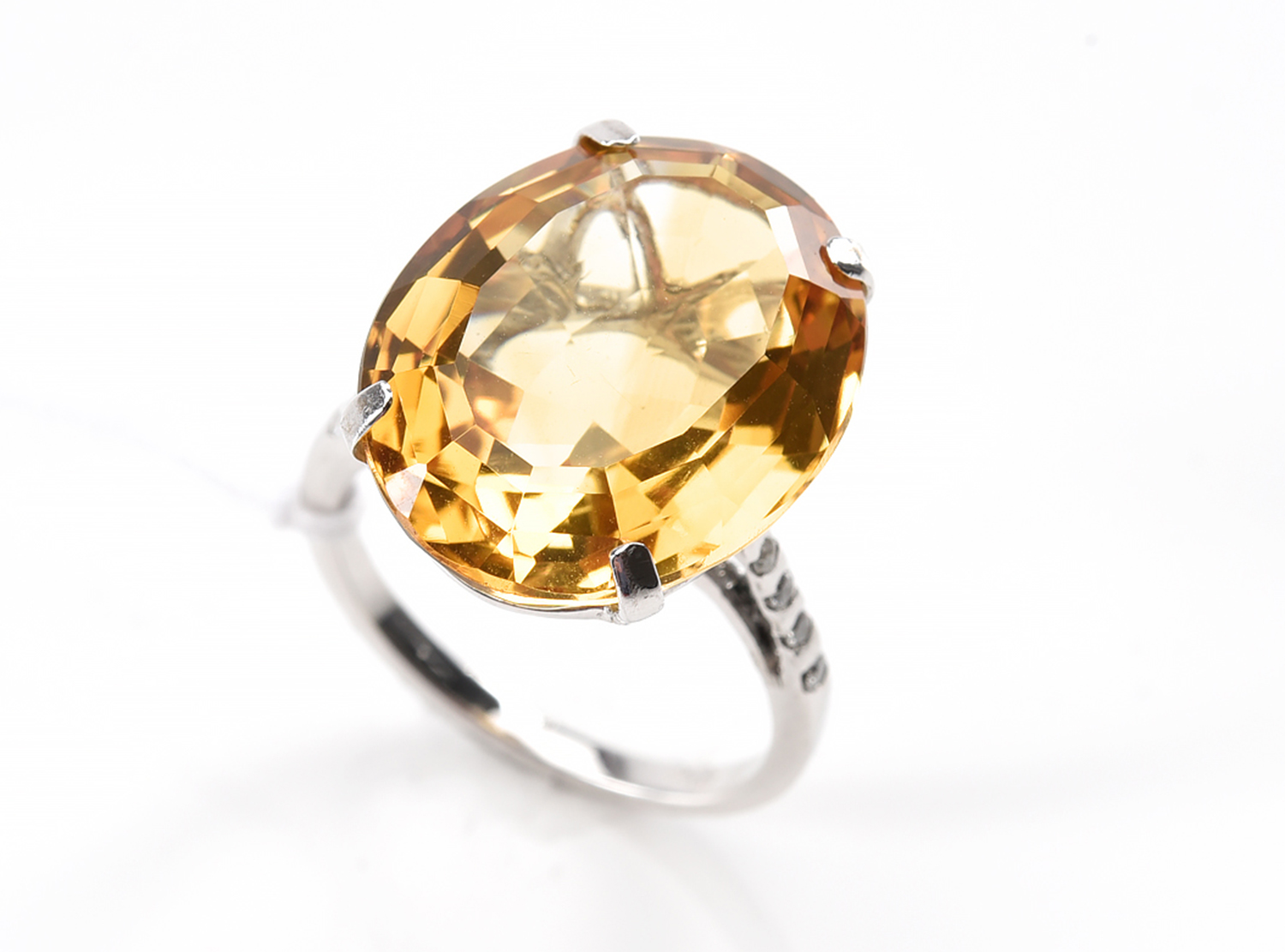 A CITRINE AND DIAMOND DRESS RING-The oval cut citrine weighing 13.60cts, to diamond set shoulders, in 18ct white gold, ring size L.