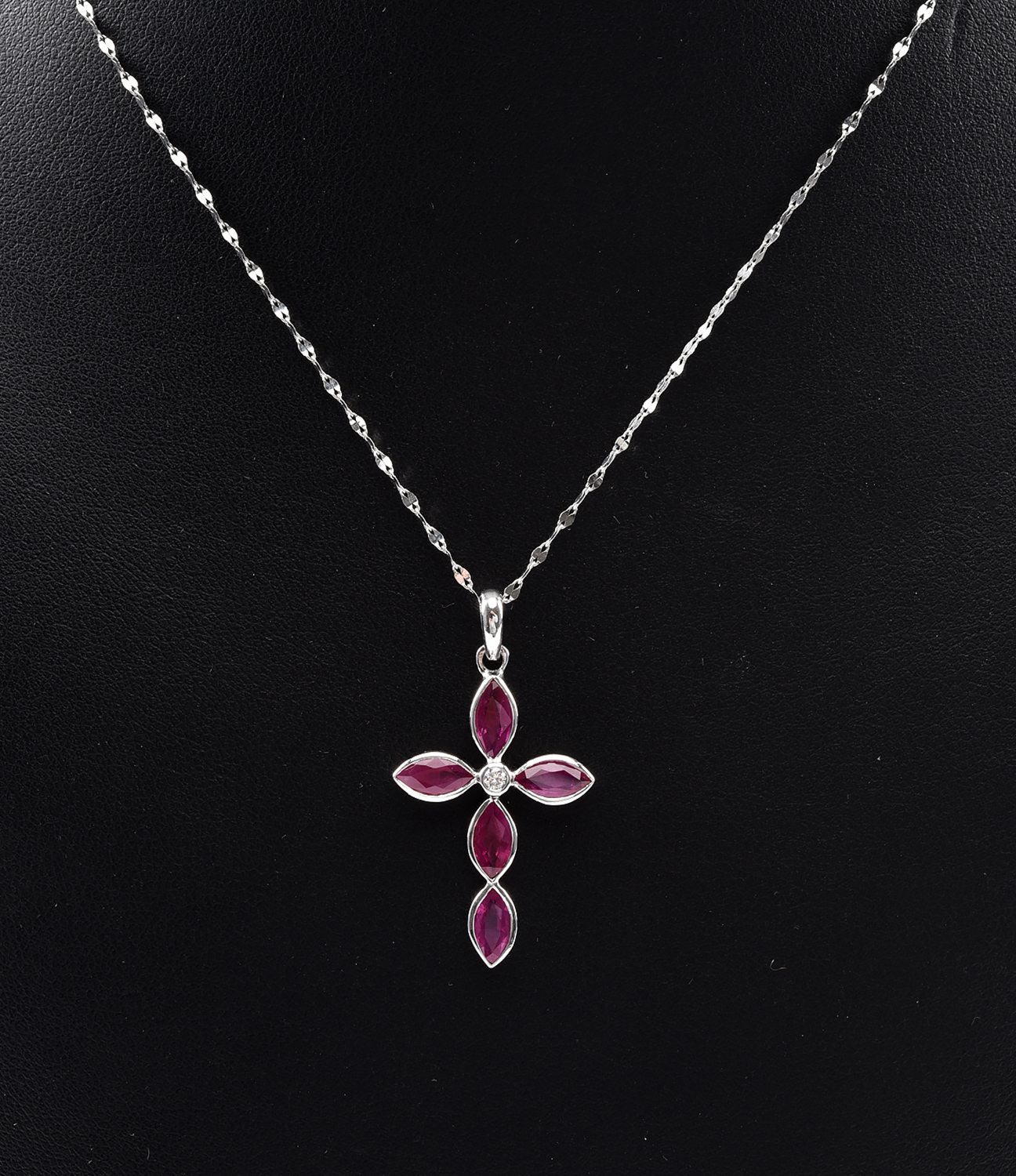 A RUBY AND DIAMOND CROSS PENDANT, COMPRISING FIVE MARQUISE CUT RUBIES, CENTRED WITH A SINGLE COLLETTE SET ROUND BRILLIANT CUT DIAMOND, IN 18CT WHITE GOLD, 25MM, SUSPENDED FROM A FANCY LINK CHAIN
